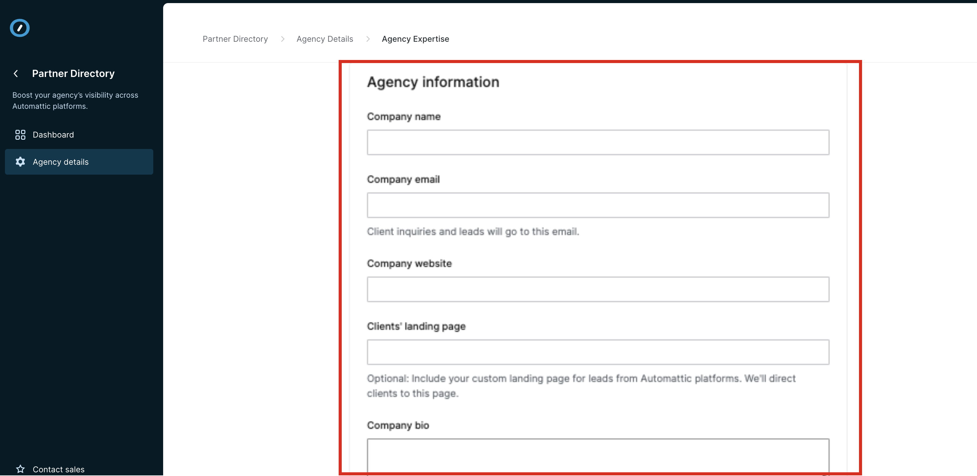 - On your agency dashboard navigate to Partner Directory > Agency details: