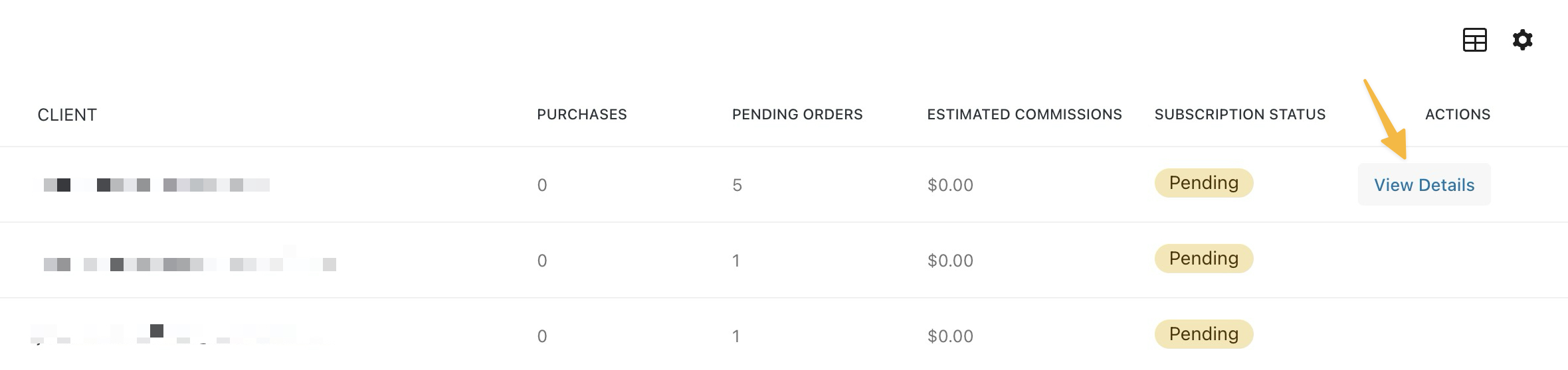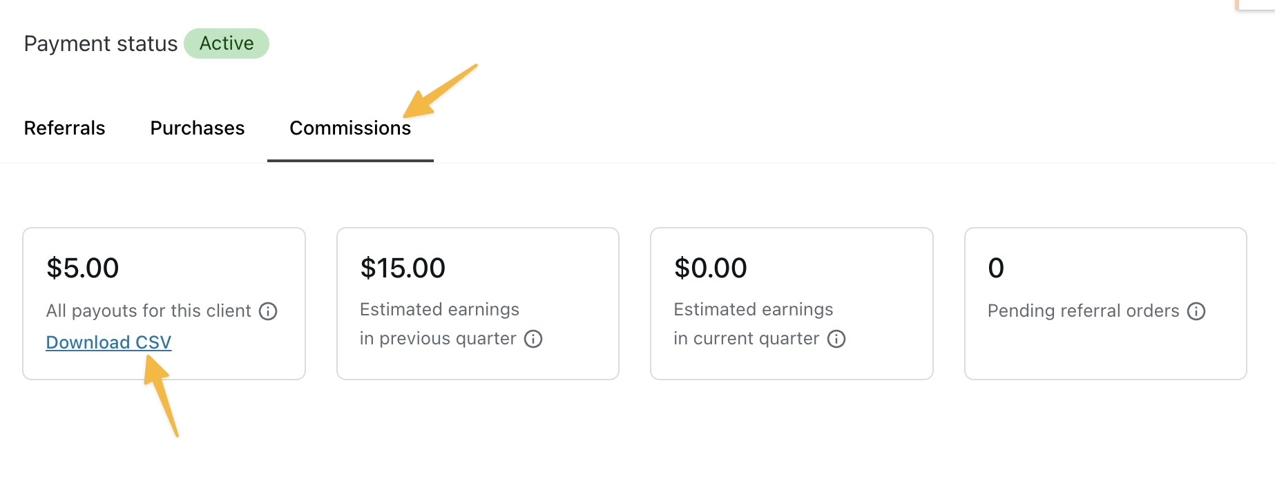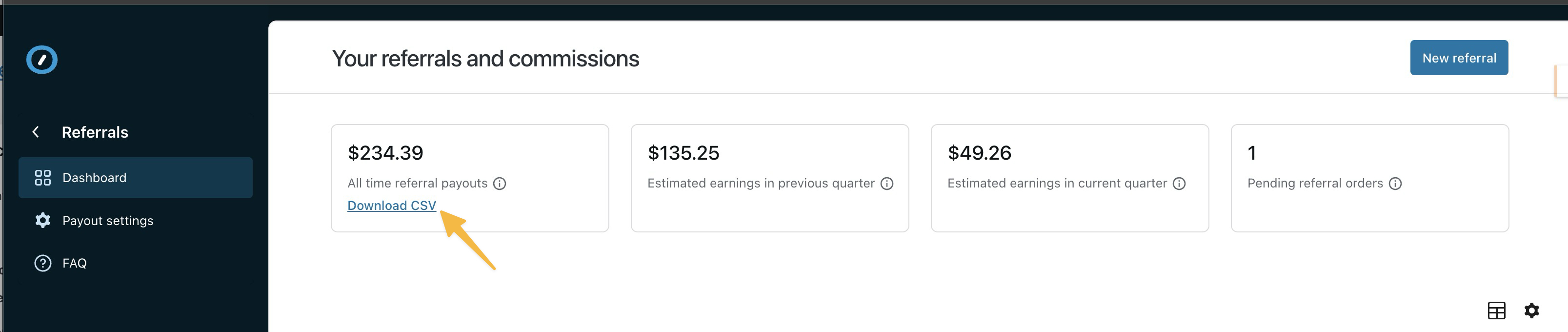 You can download a CSV file of your commission history to review your earnings in detail. The CSV includes client email, product name, quantity, invoice date, price, commission percentage, and commission amount.