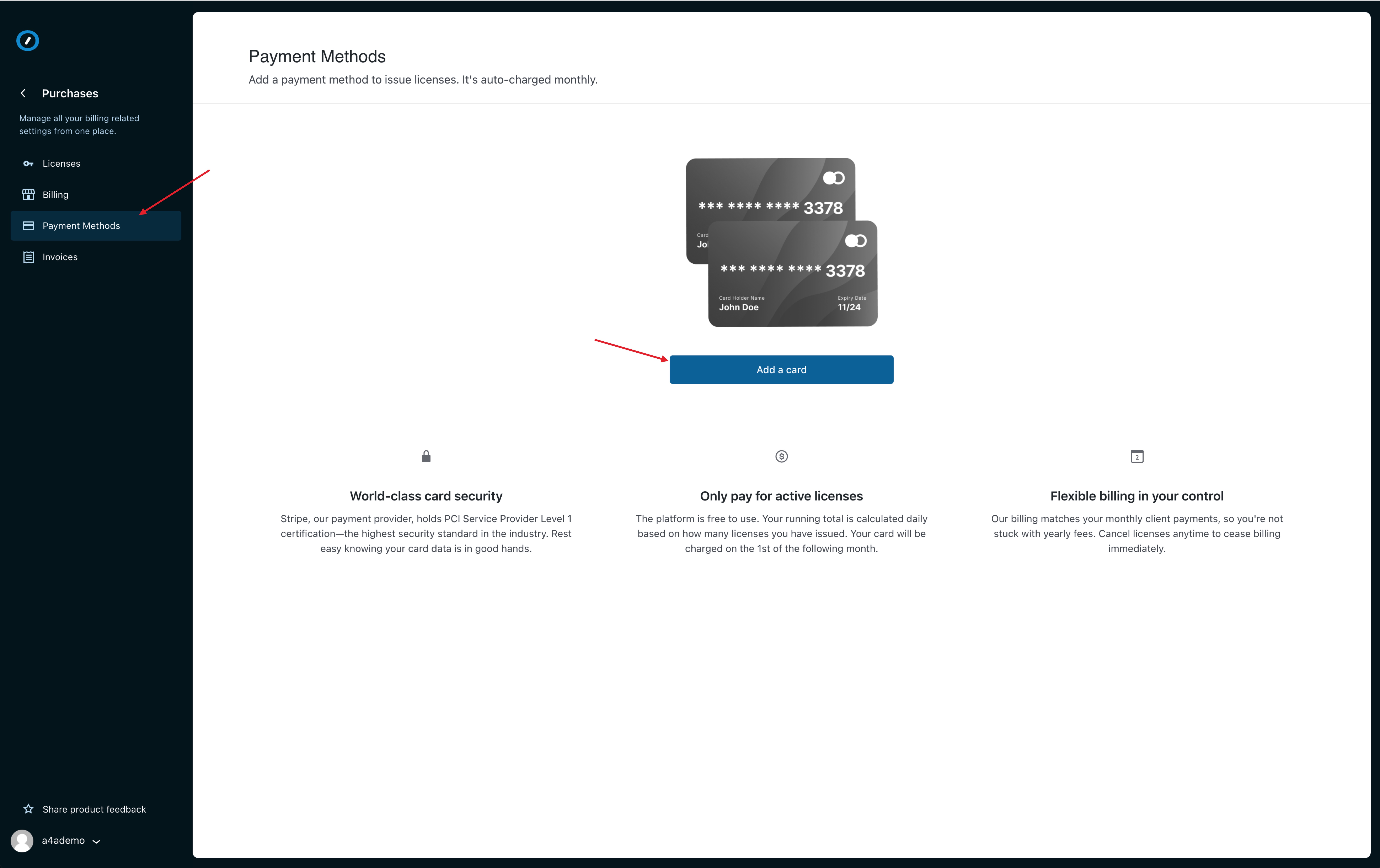 If you remove all saved payment methods before being charged for the month, you will need to pay any past-due invoices before you can assign new licenses.