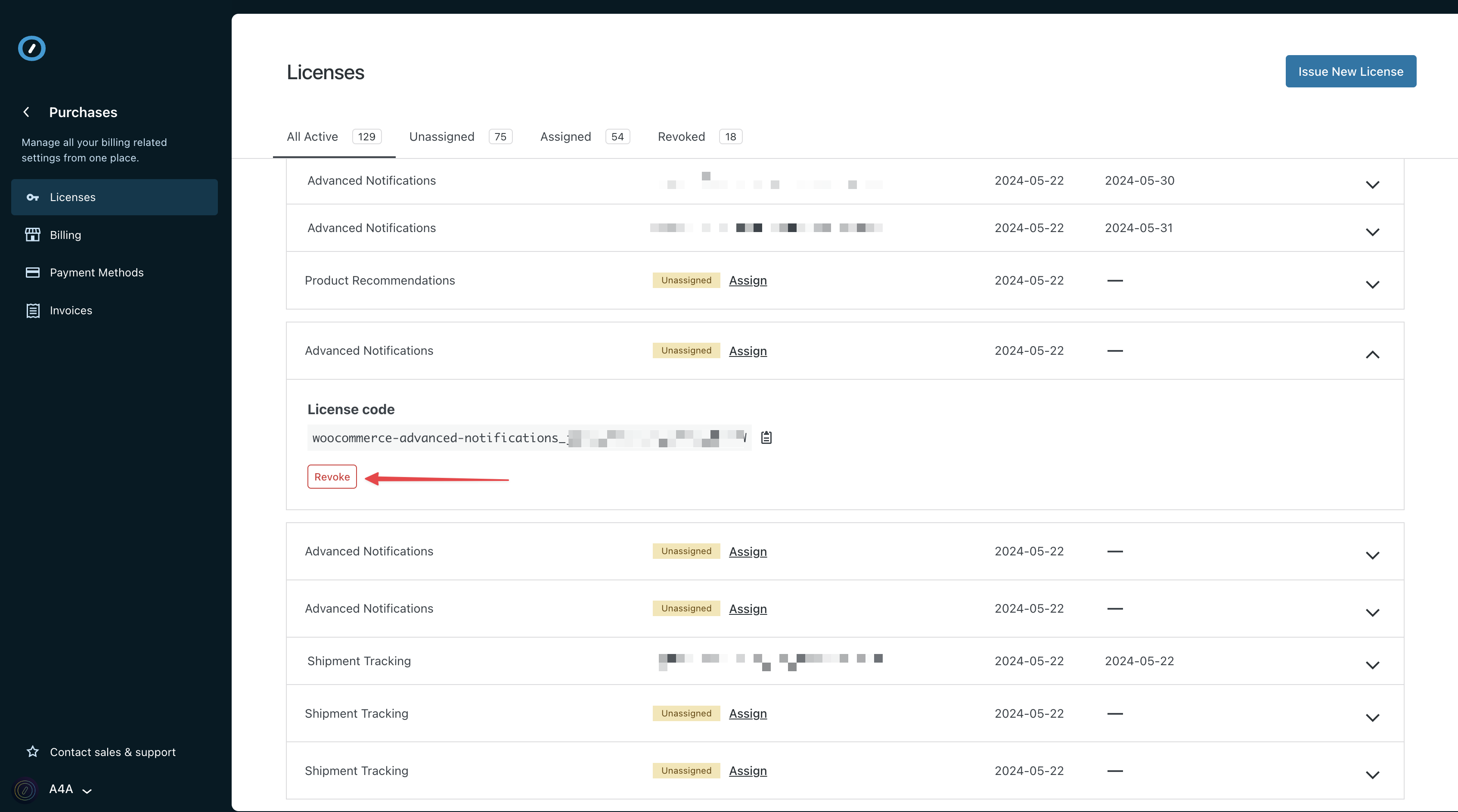 - To see all licenses that have been canceled, visit the “Revoked” tab under Purchases → Licenses.