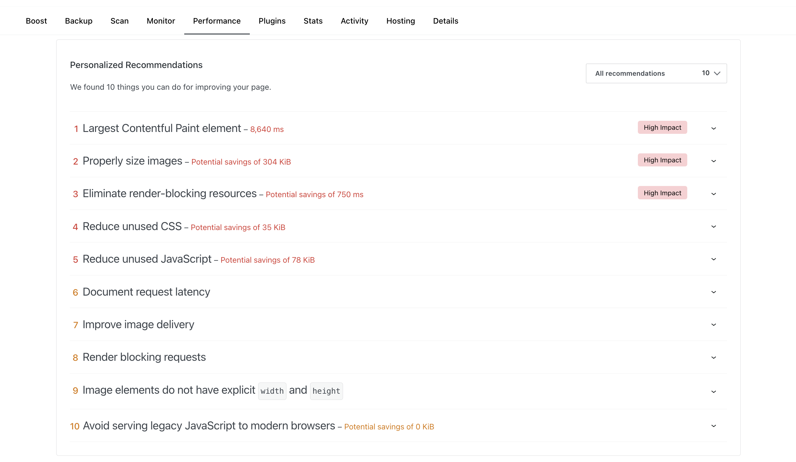 After testing your site’s performance, you receive recommendations for improving your site based on your performance score: