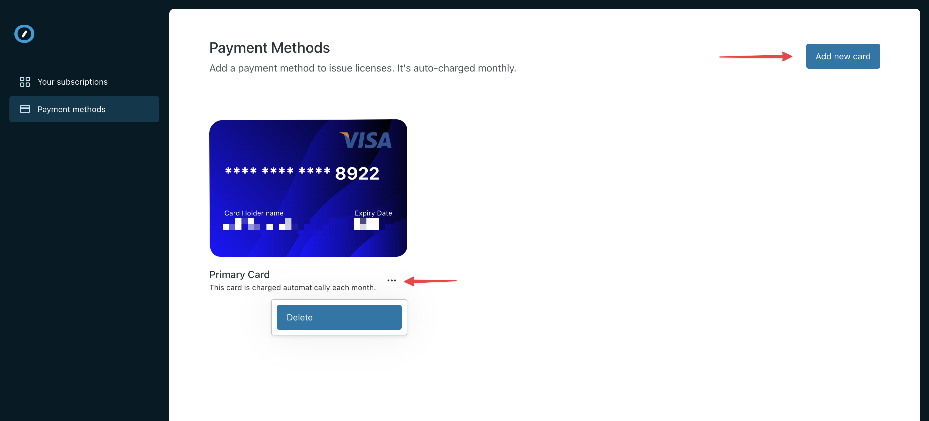 To add or delete payment methods, navigate to the payment methods area within your dashboard.