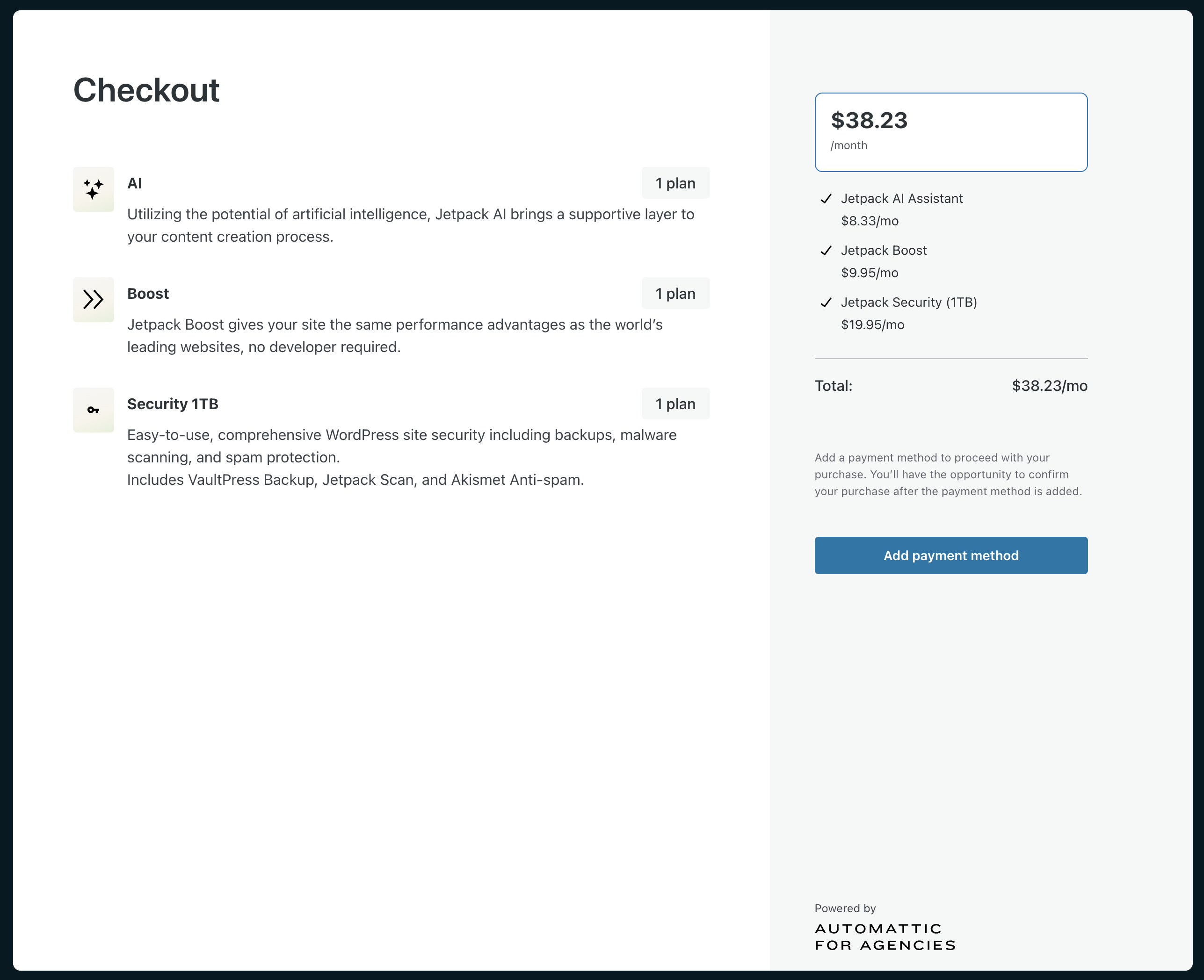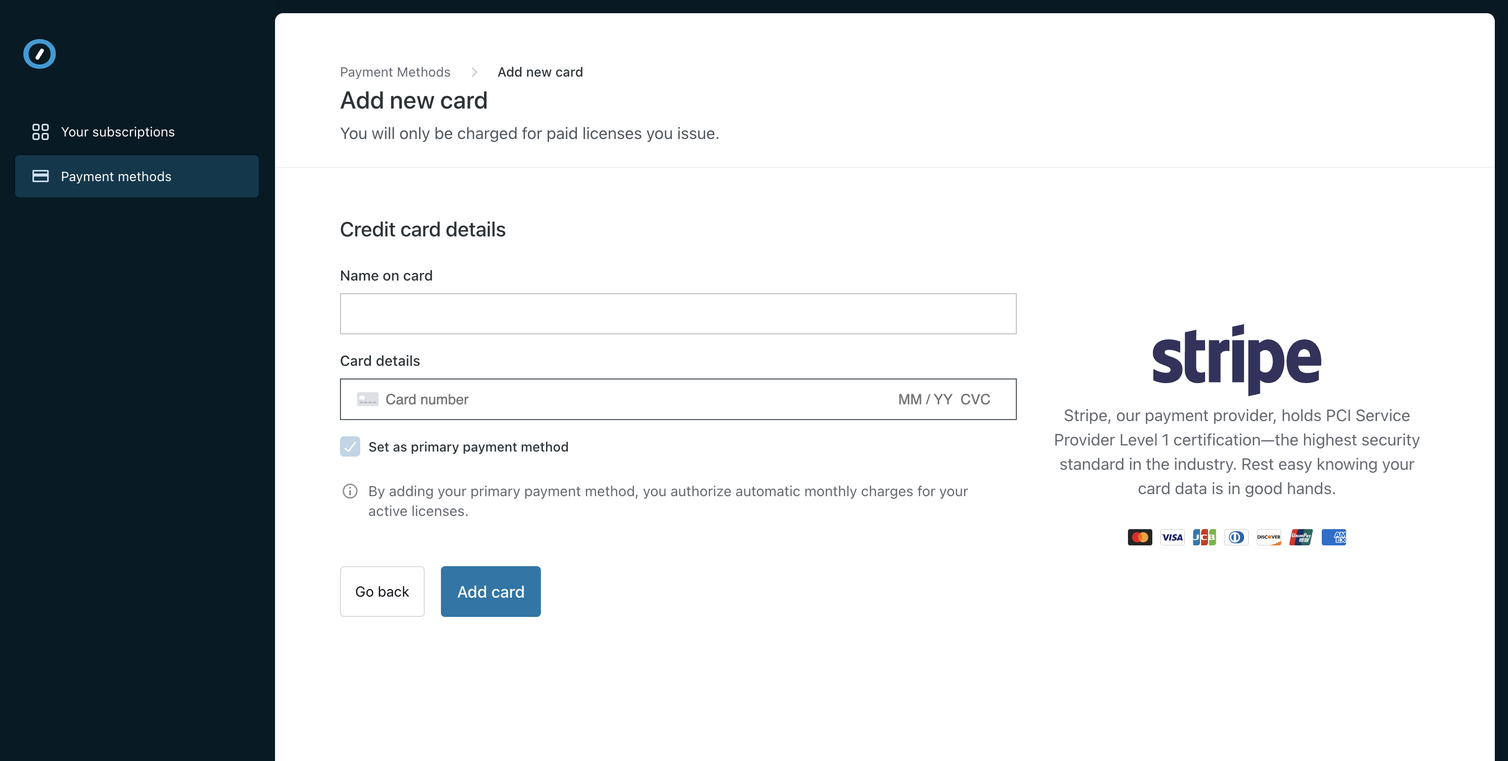 Your first visit will require you to add a payment method to your account. Automattic for Agencies use Stripe, which holds the highest security certification in the industry.