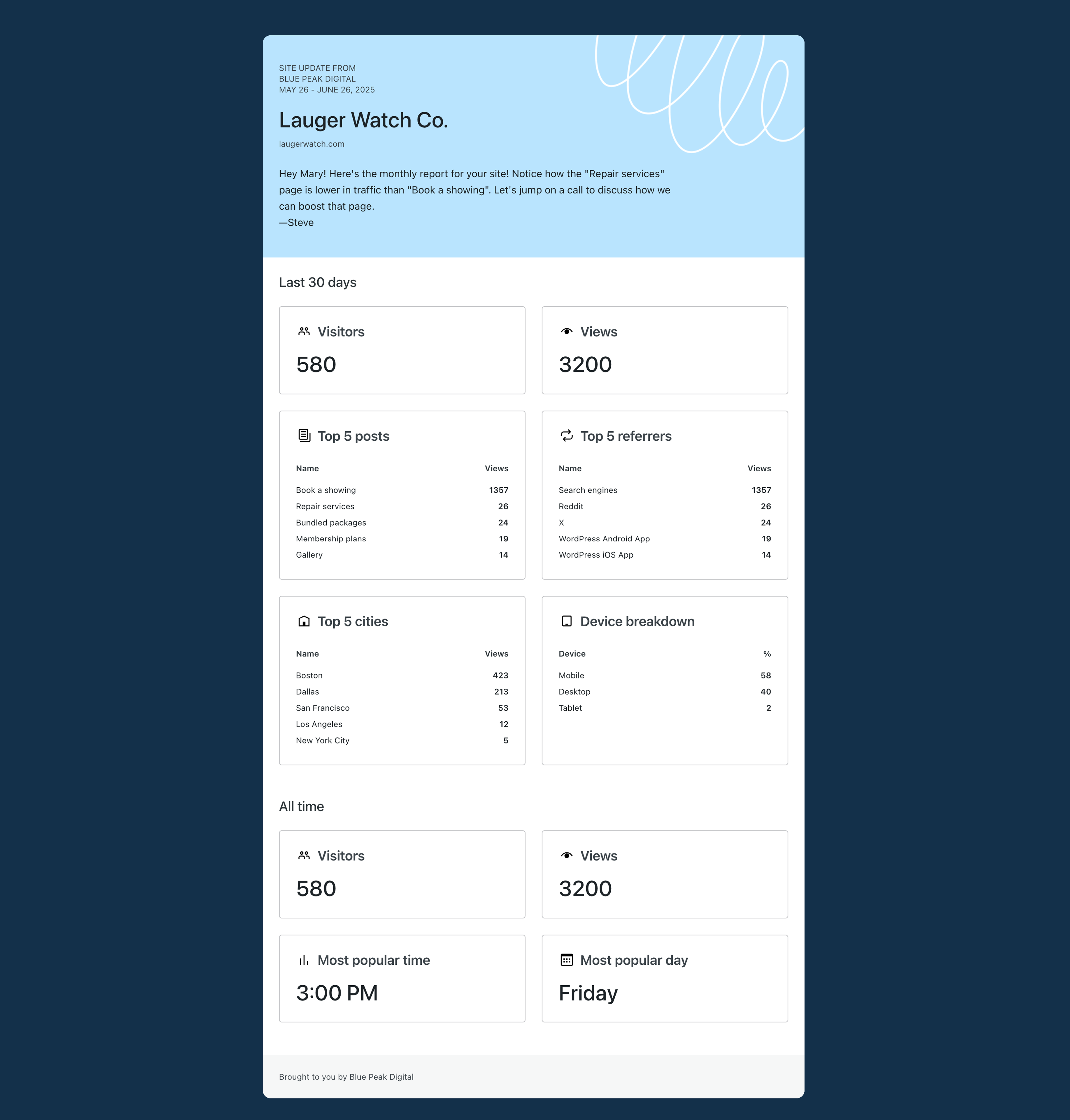 This tool helps you demonstrate your impact through polished, easy-to-read reports that keep your clients informed and confident in your work.