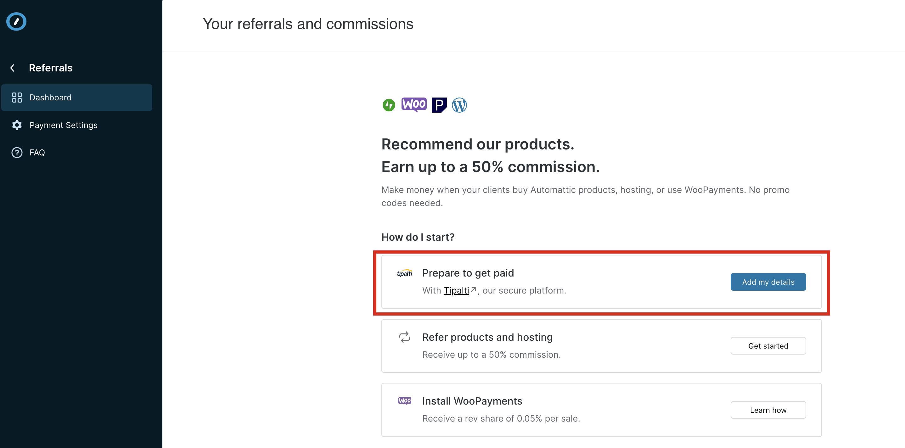 - Add your payment and tax details by clicking on “Add my details” button in the “Prepare to get paid” section. Please note, Automattic cannot provide advice on completing the tax section of these documents.