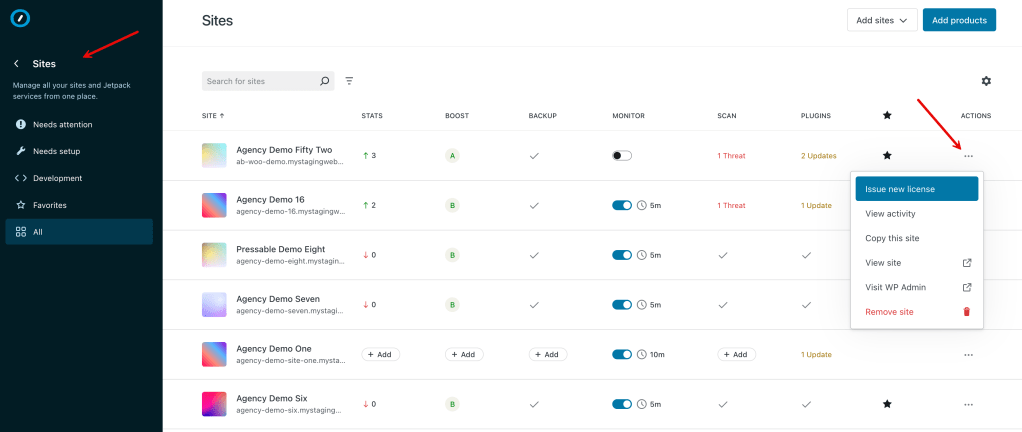 - Scan: This column allows you to see if a site has a security threat detected by Jetpack Scan. When a threat is found, the cell will highlight this and list the number of threats on the site. Clicking on found threats takes you to the Jetpack Scan dashboard so you can address them. Learn how to fix found threats. This is a paid service for sites hosted outside of Pressable or WordPress.com. See the marketplace to learn more.