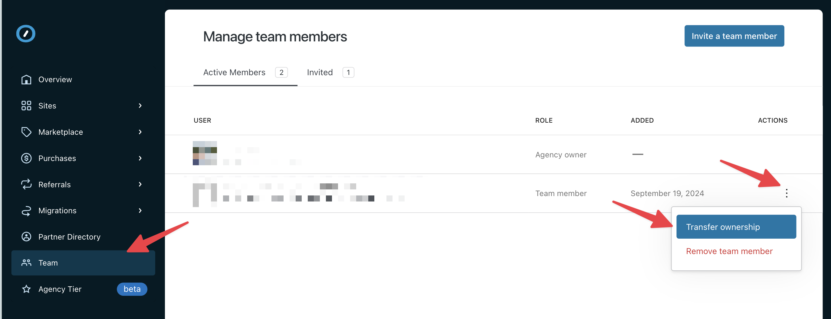 To transfer ownership, the current agency owner can navigate to the Automattic for Agencies Dashboard > Team section and click on the three dot menu next to any team member. You’ll see an option to ‘transfer ownership’.